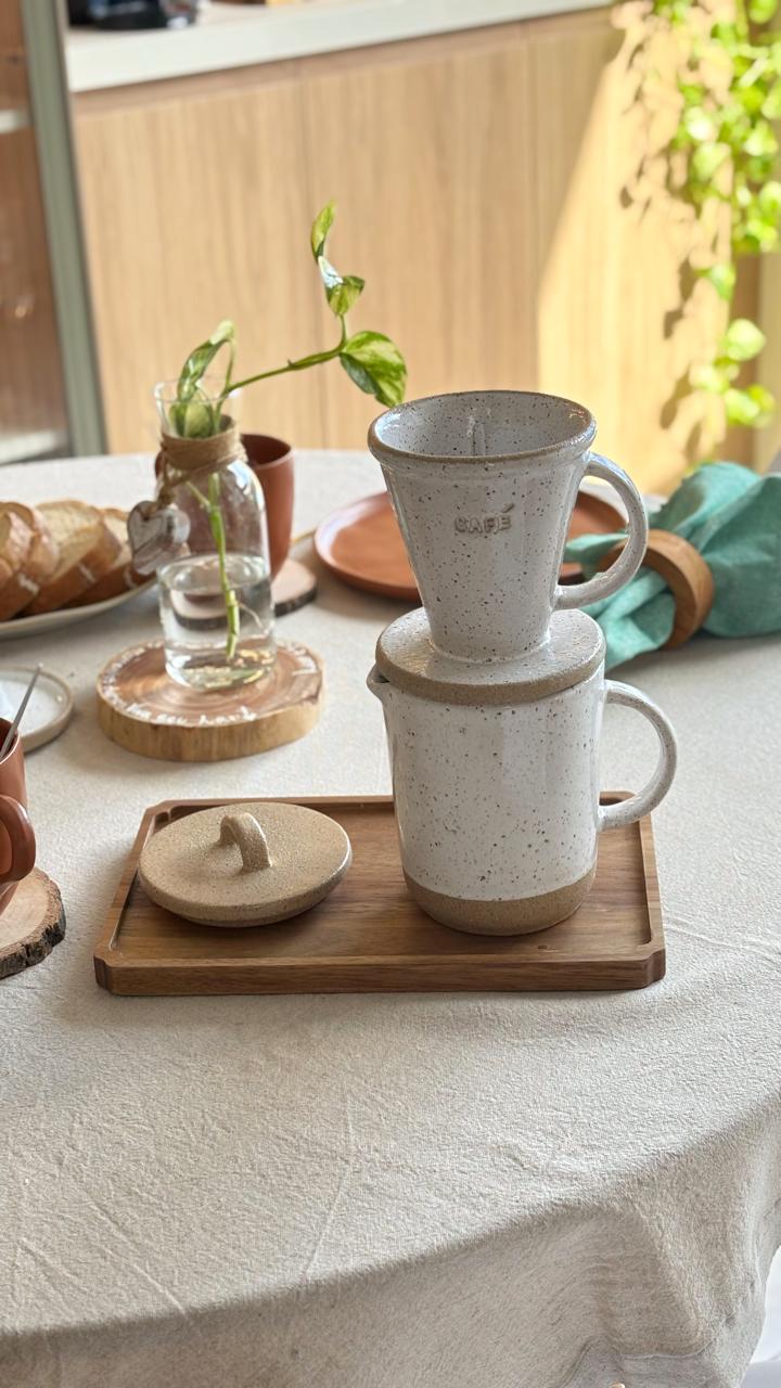 Produto em cerâmica na cor branca com detalhes nas bordas e tampa rústicos e na cor nude. Conjunto de filtro e bule.