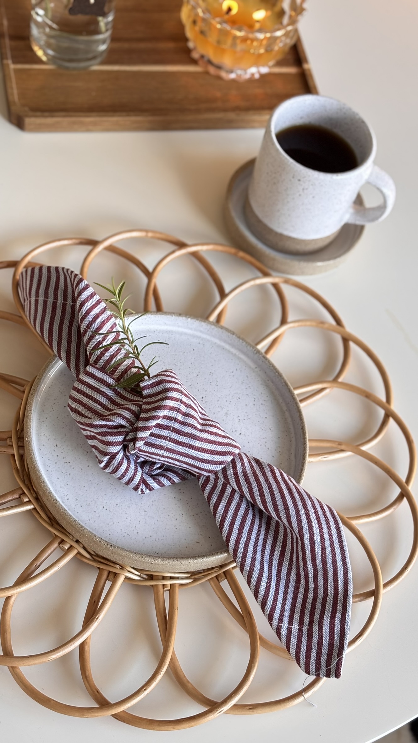 Para deixar a mesa posta com um toque de cor e elegância! As listras nunca saem de moda, e são perfeitas para combinar com bases mais neutras, como americanos de fibras naturais ou de cor lisa.