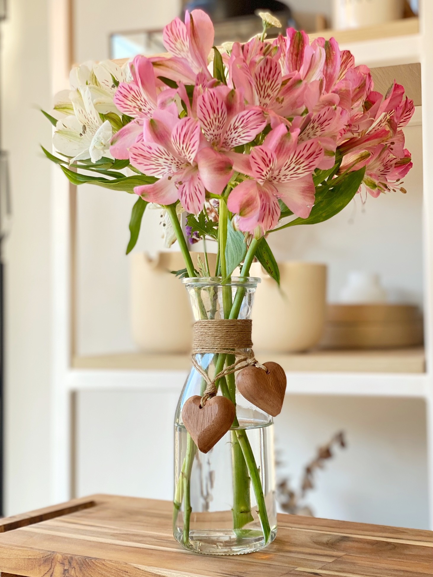 O toque rústico dos detalhes em cordão e os pingentes de coração deixam este vaso ainda mais lindo. A leveza do vidro complementa para que o vaso fique leve e elegante.
